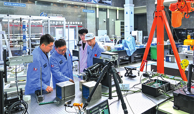 中國科學(xué)院空間光學(xué)系統(tǒng)在軌制造與集成重點(diǎn)實驗室副主任徐振邦(左二)與同事在實驗室內(nèi)討論科研工作(2023年5月25日攝) 許暢攝 / 本刊