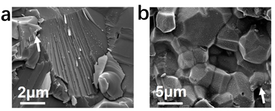 低溫 400℃ 下穿晶斷裂(a)和高溫 800℃ 下沿晶斷裂(b)特征 圖片來源:蘭州化物理所