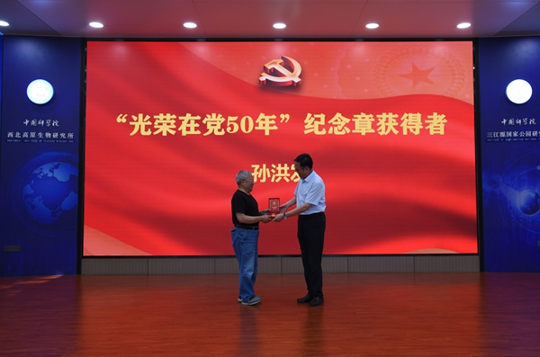 會議第二階段,在雄壯的國歌聲中,西北高原所召開慶祝建黨103周年表彰大會。楊勇剛宣讀了《中共中國科學院西北高原生物研究所委員會關(guān)于表彰先進黨支部、優(yōu)秀共產(chǎn)黨員和優(yōu)秀黨務(wù)工作者的決定》。首先,所長陳世龍向?qū)O洪發(fā)同志頒發(fā)“光榮在黨50年”紀念章,代表所黨委向?qū)O洪發(fā)同志表示祝賀,并對他多年來為黨的事業(yè)盡心竭力、無私奉獻致以崇高的敬意。