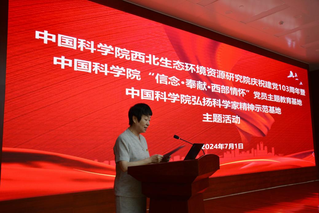 為慶祝中國共產(chǎn)黨成立103周年,7月1日,中國科學(xué)院西北生態(tài)環(huán)境資源研究院舉行中國科學(xué)院“信念·奉獻(xiàn)·西部情懷”黨員主題教育基地、中國科學(xué)院弘揚科學(xué)家精神示范基地主題活動。西北研究院黨委委員、領(lǐng)導(dǎo)班子成員、紀(jì)委委員、院務(wù)委員,黨支部書記、支部委員,研究室(中心)、實驗室、野外臺站和管理部門黨員負(fù)責(zé)人,黨員代表等參加活動。黨委副書記、紀(jì)委書記王萍主持活動。