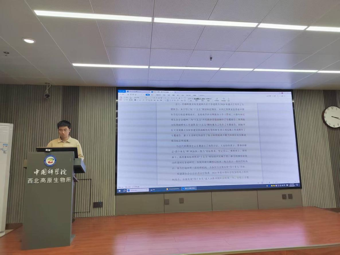 組織委員兼紀(jì)檢委員張昆領(lǐng)學(xué)了習(xí)近平在中共中央政治局第二十四次集體學(xué)習(xí)會(huì)議精神,通報(bào)了《中共中國科學(xué)院西北高原生物研究所委員會(huì)2025年度黨員領(lǐng)導(dǎo)干部民主生活會(huì)征求意見反饋》。