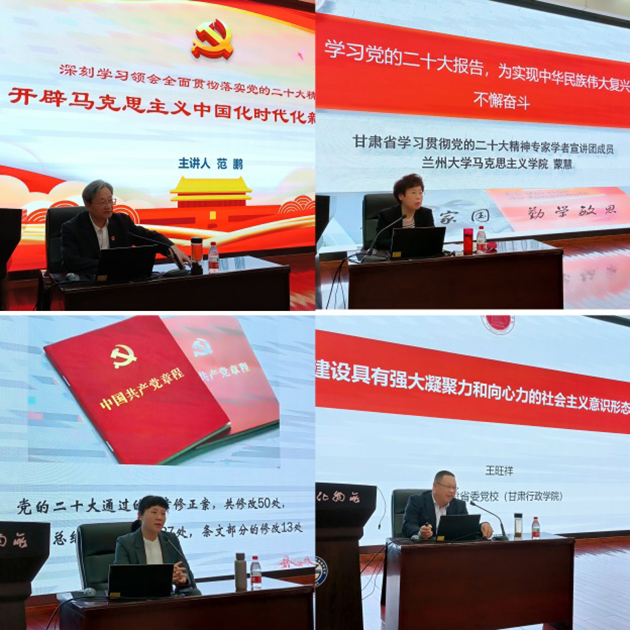 中共甘肅省委黨校文史教研部主任王旺祥教授,甘肅省委專家學(xué)者宣講團(tuán)成員、中共甘肅省委黨校黨的建設(shè)與領(lǐng)導(dǎo)科學(xué)教研部主任高璐佳,甘肅省學(xué)習(xí)貫徹黨的二十大精神專家學(xué)者宣講團(tuán)成員、蘭州大學(xué)馬克思主義學(xué)院蒙慧教授,甘肅省委專家學(xué)者宣講團(tuán)成員、蘭州大學(xué)范鵬教授分別應(yīng)邀作了題為“建設(shè)具有強(qiáng)大凝聚力和向心力的社會(huì)主義意識(shí)形態(tài)”“黨的二十大黨章修改的重點(diǎn)內(nèi)容及其重大深遠(yuǎn)歷史意義”“學(xué)習(xí)黨的二十大報(bào)告,為實(shí)現(xiàn)中華民族偉大復(fù)興不懈奮斗”“深刻學(xué)習(xí)領(lǐng)會(huì)全面貫徹落實(shí)黨的二十大精神 開辟馬克思主義中國(guó)化時(shí)代化新境界”的報(bào)告。