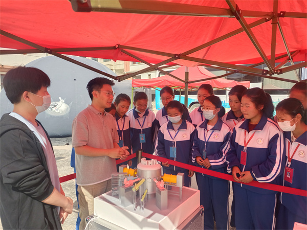 “科學(xué)快車”集車廂內(nèi)展廳、戶外可移動展區(qū)、球幕充氣影院為一體,具有即時性強、互動性強、移動性強等特點。各類設(shè)備模型前,同學(xué)們流連駐足,仔細觀摩,熱烈討論;互動小實驗時,孩子們踴躍參與,眼睛里充滿好奇與渴望;車廂內(nèi)的互動展廳利用沉浸式環(huán)境和交互式手段,更是讓大家直呼驚奇,在參與中體驗神奇的科技世界。