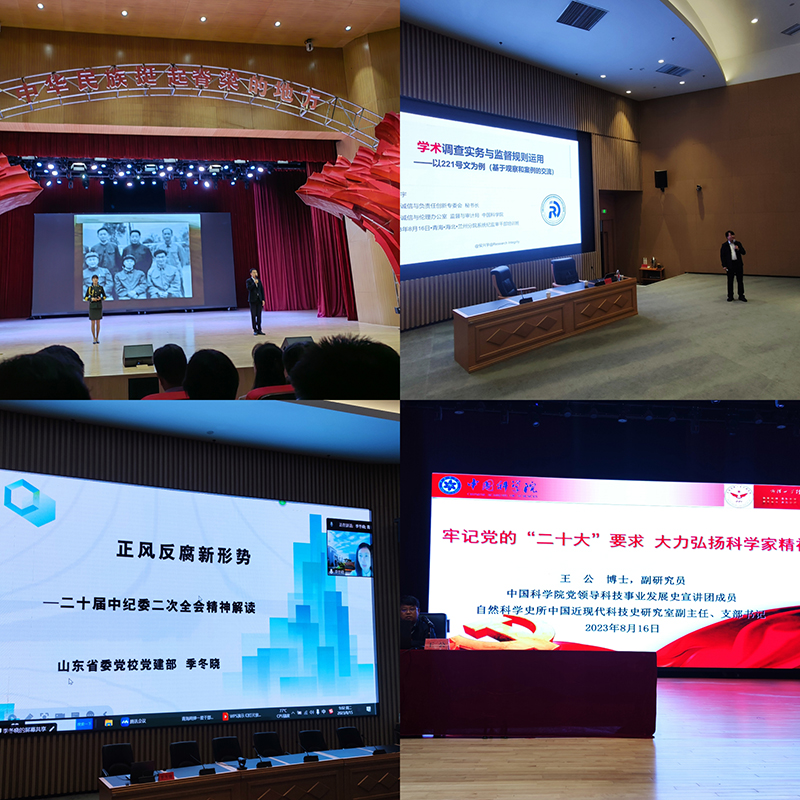 此次培訓結(jié)合工作實際,特邀了山東省委黨校季冬曉教授對二十屆中紀委二次全會精神進行解讀,讓參訓人員更加清晰地對全面從嚴治黨體系,特別是黨內(nèi)監(jiān)督的具體內(nèi)容有了更加深入的理解;中國科學院監(jiān)督與審計局科研誠信與倫理辦公室主任侯興宇作題為《學術(shù)調(diào)查實務(wù)與監(jiān)督規(guī)則運用》輔導報告,提升了在處理科研誠信案件中分析運用的能力;中國近現(xiàn)代科技史研究室副主任、中國科學院黨領(lǐng)導科技事業(yè)發(fā)展史宣講團隊成員、中國科學院自然科學史研究所副研究員王公作《牢記黨的二十大要求 大力弘揚科學家精神》專題講座,以梳理和講述中國科學史的發(fā)展進程為主線,將一代又一代無私奉獻,攻堅克難,以家國命運為己任的科學家事跡貫穿其中,逐步深入地闡述了科學家精神的內(nèi)涵及其時代價值。