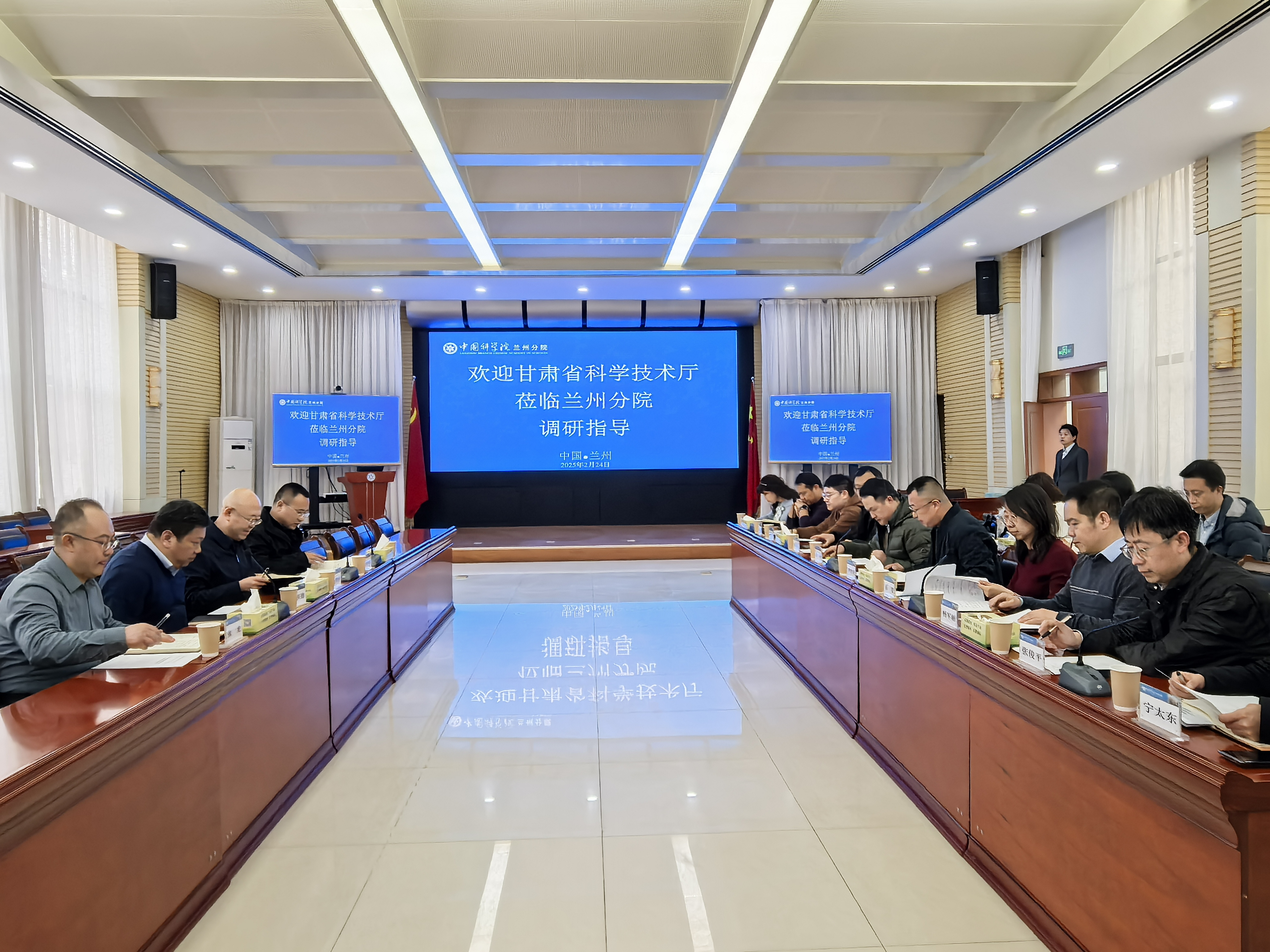2月24日,甘肅省科技廳二級巡視員王明學(xué)一行圍繞甘肅省科技創(chuàng)新政策重點措施落實情況到中國科學(xué)院蘭州分院開展專題調(diào)研。院屬在甘研究所人事、科研、財務(wù)部門相關(guān)負(fù)責(zé)人及部分科研人員、蘭州分院科技合作處參加座談。