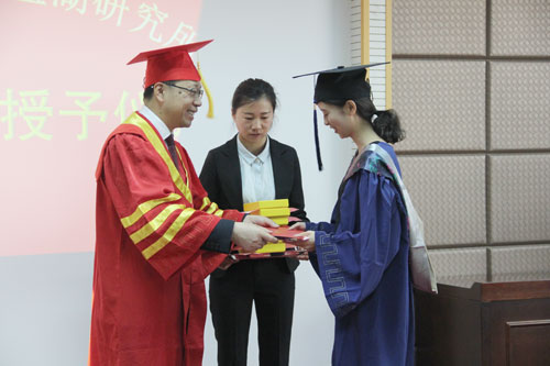 畢業(yè)典禮在與會人員集體奏唱國歌聲中拉開序幕。主持工作的副所長吳志堅代表所領(lǐng)導(dǎo)發(fā)表講話,對2017屆畢業(yè)生表示衷心地祝賀,對今后的發(fā)展提出了四個“好”:思想好、身體好、學(xué)習(xí)好、工作好。殷切期望畢業(yè)生能有一個積極、樂觀、不斷進(jìn)取的健康思想,能夠積極進(jìn)行體育鍛煉,保持健康身體,能夠在今后的道路上不斷學(xué)習(xí),成為今后工作崗位上的棟梁之才,能夠積極應(yīng)對工作中遇到的各種情況,對工作富有熱情。吳志堅還宣讀了中國科學(xué)院大學(xué)丁仲禮校長給2017屆畢業(yè)生的一封信,希望畢業(yè)生擔(dān)負(fù)起丁仲禮校長所給予的厚望。