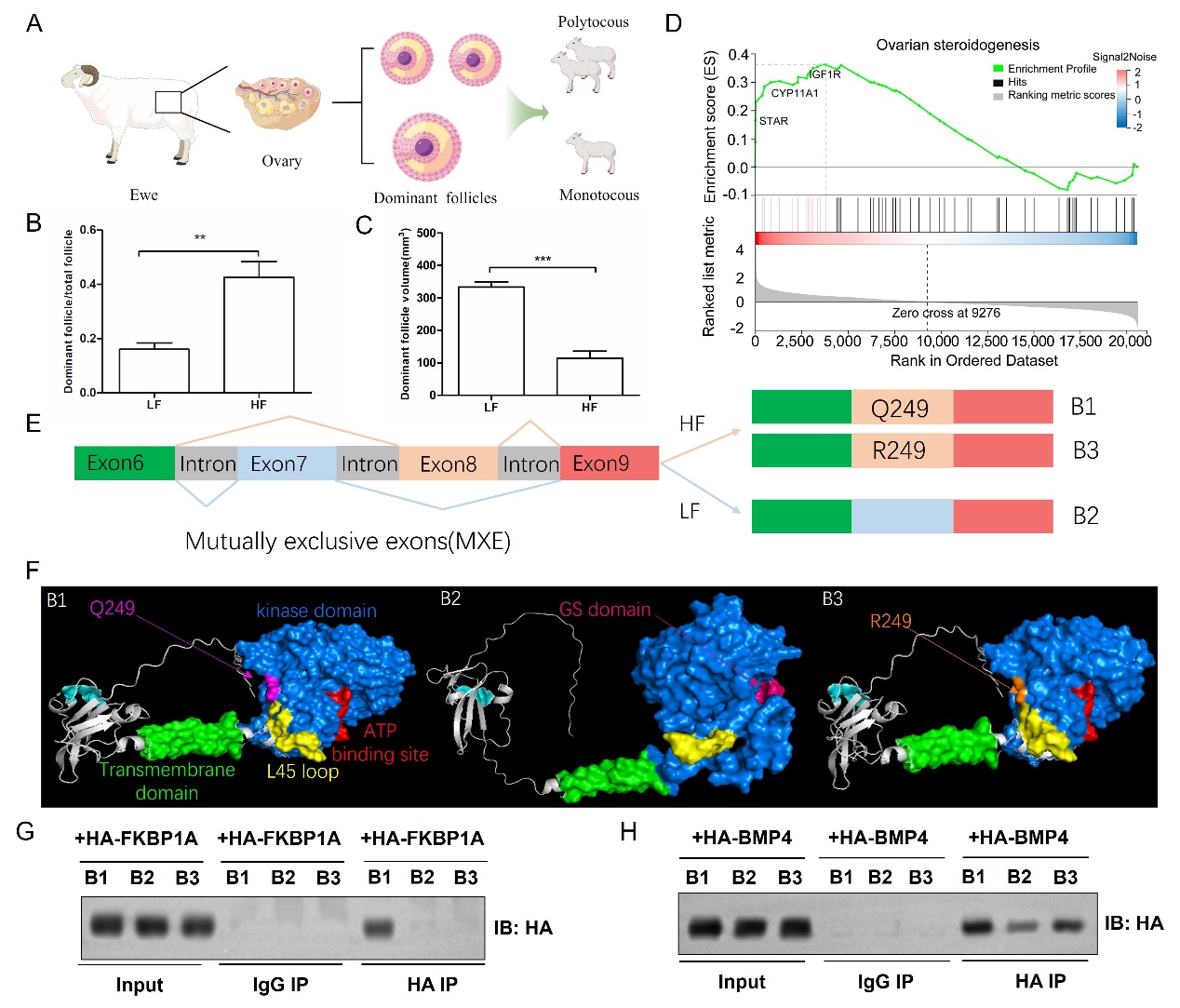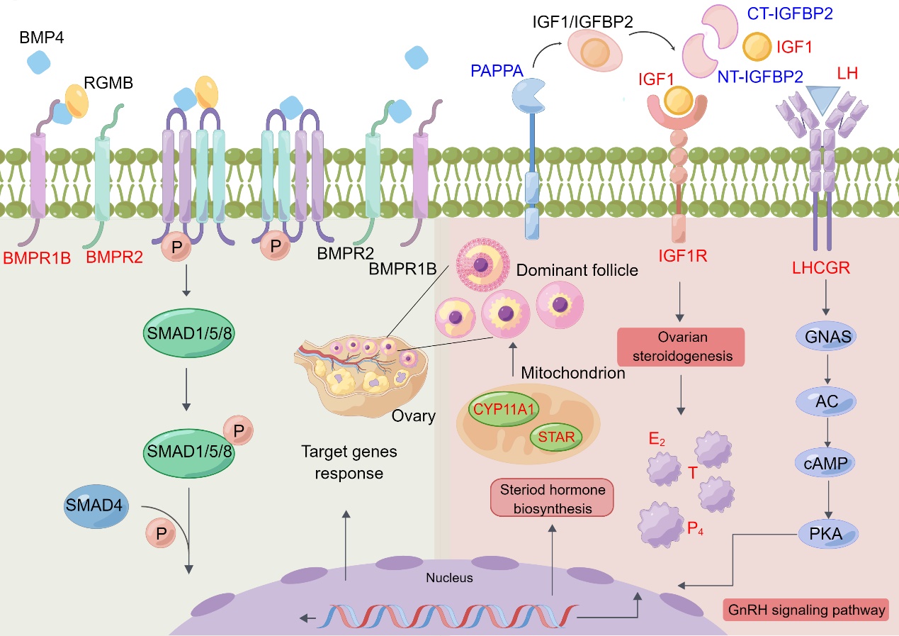 中國科學院西北高原生物研究所動物生態(tài)與資源保護研究團隊針對綿羊重要繁殖性狀(產(chǎn)羔數(shù)和產(chǎn)羔間隔),以連續(xù)三個產(chǎn)羔季節(jié)產(chǎn)多胎(每胎產(chǎn)兩羔或三羔,HF)和產(chǎn)單胎(每胎產(chǎn)一羔,LF)的藏羊為研究對象,整合全基因組關聯(lián)分析、普通轉錄組學、單細胞轉錄組學、蛋白質(zhì)組學和代謝組學等多組學研究方法,結合KASP基因分型、實時熒光定量PCR、酶聯(lián)免疫吸附實驗、免疫共沉淀和蛋白質(zhì)免疫印跡等分子功能驗證實驗,挖掘藏羊產(chǎn)羔數(shù)和產(chǎn)羔間隔關鍵調(diào)控元件并揭示其高繁殖力的遺傳調(diào)控機制。全基因組關聯(lián)研究表明,BMPR1B基因與產(chǎn)羔數(shù)性狀相關,PAPPA基因與產(chǎn)羔間隔性狀相關。首次構建了藏羊卵巢單細胞圖譜,發(fā)現(xiàn)關鍵基因PAPPA特異性表達在壁層顆粒細胞亞群,且BMPR1B基因在壁層顆粒細胞和固醇生成顆粒亞群高表達?;趩渭毎D錄組學、蛋白質(zhì)組學和代謝組學整合分析,發(fā)現(xiàn)PAPPA是刺激卵巢優(yōu)勢卵泡生長發(fā)育和類固醇生成的關鍵候選基因。繁殖主效基因BMPR1B除了非同義突變,首次在藏羊中發(fā)現(xiàn)BMPR1B還存在可變剪接事件調(diào)控多胎性狀。該研究結果對分子精準選育提升藏羊繁殖力和實現(xiàn)藏羊產(chǎn)業(yè)提質(zhì)增效具有重要意義。