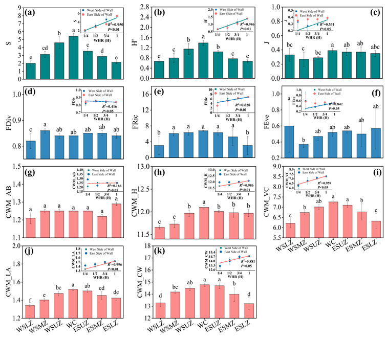 圖1 長(zhǎng)城遺址不同微空間位置物種豐富度(a)、物種多樣性(b)、物種均勻度(c)、功能均勻度(d)、功能分化度(e)、功能豐富度(f)、群落加權(quán)平均_生物量(CWM_AB,g)、群落加權(quán)平均_株高(CWM_H,h)、群落加權(quán)平均_蓋度(CWM_VC,i)、群落加權(quán)平均_葉面積(CWM_LA,j)、群落加權(quán)平均_冠幅(CWM_CW,k)變化情況.