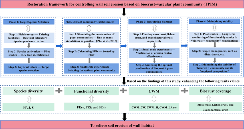研究發(fā)現(xiàn),維管束植物物種豐富度、物種多樣性、功能豐富度、群落加權(quán)平均和苔蘚結(jié)皮蓋度由土長(zhǎng)城遺址頂部向下部顯著降低,且與土長(zhǎng)城兩側(cè)土體侵蝕程度呈負(fù)相關(guān)(圖1),表明土長(zhǎng)城本體較高的區(qū)域有利于維管束植物和生物結(jié)皮的定殖和生長(zhǎng)。同時(shí),維管束植物和生物結(jié)皮的協(xié)同作用能有效緩解遺址本體遭受風(fēng)雨侵蝕(圖2)。基于此,研究人員提出了基于生物結(jié)皮和維管束植物群落構(gòu)建目標(biāo)物種選擇、植物群落構(gòu)建、生物結(jié)皮接種和維持群落穩(wěn)定等增強(qiáng)土長(zhǎng)城抗侵蝕的“修復(fù)框架”(圖3),為土長(zhǎng)城遺址本體侵蝕防治提供了新思路。