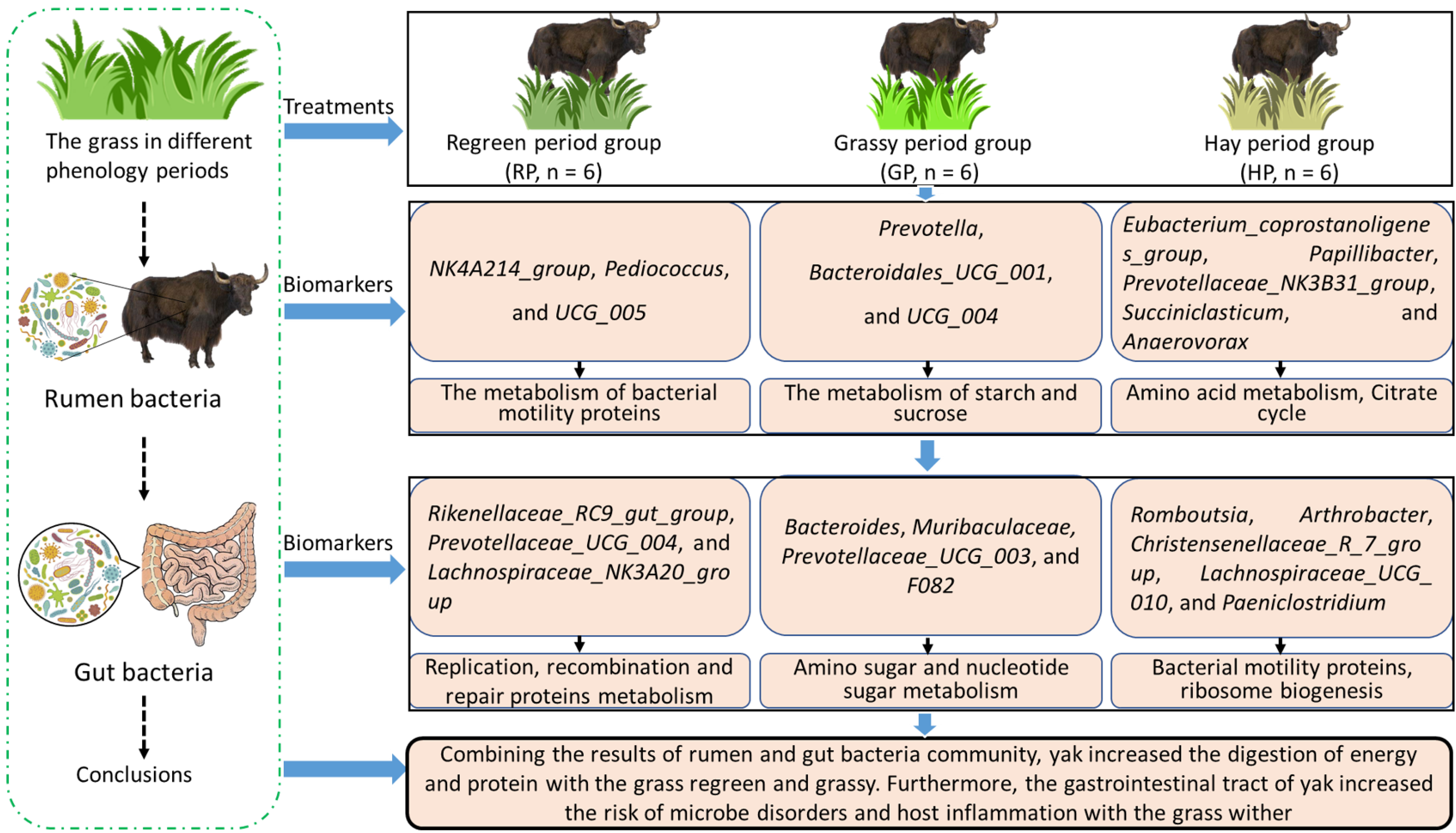 中國科學(xué)院西北高原生物研究所高寒生態(tài)監(jiān)測與可持續(xù)發(fā)展研究團(tuán)隊(duì)以放牧牦牛為研究對象,以牧草營養(yǎng)組成、腸道微生物和牦牛肉品質(zhì)為切入點(diǎn),采用16S rRNA測序和代謝組學(xué)等研究方法。探究了不同物候期牧草組成對牦牛胃腸道微生物及肉品質(zhì)的影響,闡明了“物候期牧草-瘤胃微生物-牦牛肉品質(zhì)”之間的關(guān)系及其調(diào)控機(jī)制。結(jié)果表明,不同物候期的牧草營養(yǎng)組成改變了放牧牦牛瘤胃微生物群落,同時(shí),微生物的季節(jié)性變化參與了牦牛肉品質(zhì)的調(diào)控。