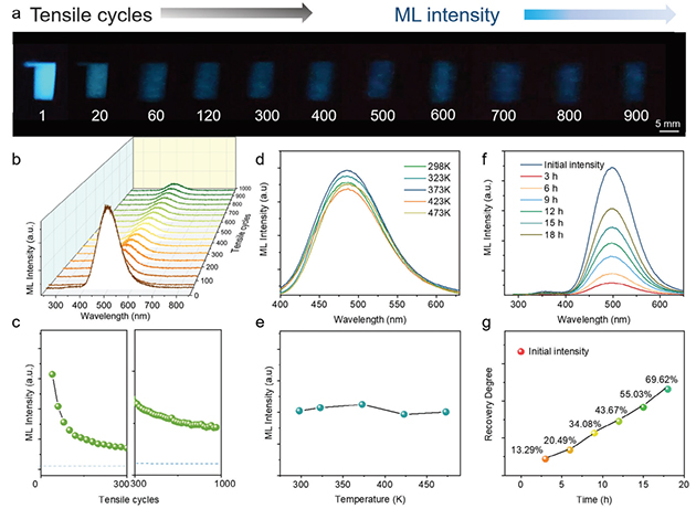 相較于已報道的自恢復摩擦/力致發(fā)光體系,Ca6BaP4O17:Ce3+/PDMS材料進一步克服了摩擦/力致發(fā)光的重復性和穩(wěn)定性不足的問題。在10Hz連續(xù)拉伸條件下,該材料可持續(xù)展現(xiàn)出近1000次肉眼可見的藍色發(fā)光。此外,Ca6BaP4O17:Ce3+/PDMS復合材料在298-473K溫度范圍內還展現(xiàn)出了較好的熱穩(wěn)定性能(圖2)。Ca6BaP4O17:Ce3+/PDMS材料的上述摩擦/力致發(fā)光性能主要得益于Ca6BaP4O17:Ce3+獨特的晶體結構和電子結構以及PDMS較強的電子吸附能力,二者在界面摩擦時的協(xié)同效應使得界面摩擦電場誘導電子轟擊發(fā)光過程更加有效。