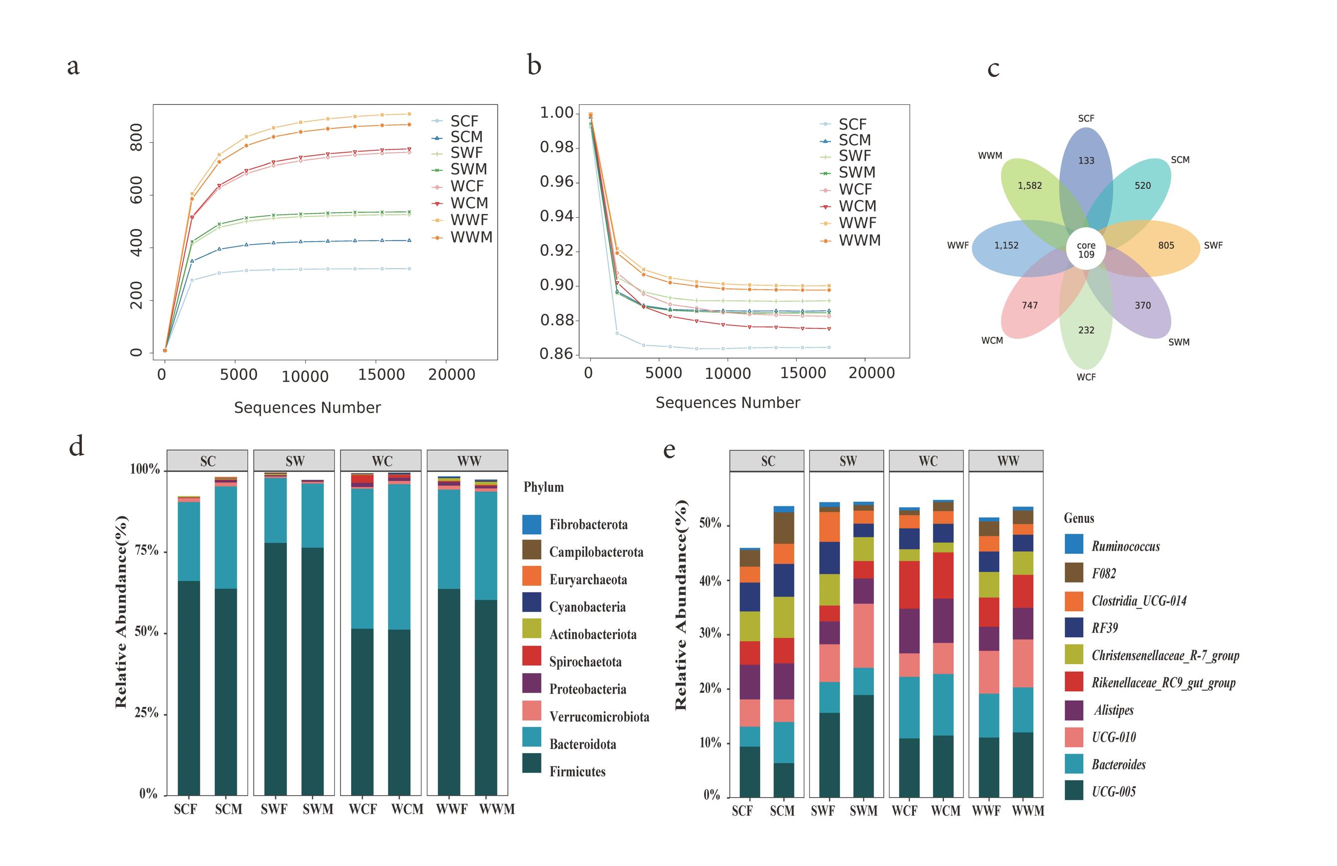 巖羊腸道菌群群落豐富度(a)和均勻度(b)稀釋曲線;不同組間ASV數量花瓣圖(c);門水平(d)和屬水平(e)巖羊腸道菌群相對豐度堆積直方圖