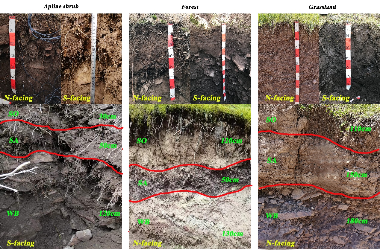 圖1 剖面中土壤和風化基巖特征。SO:土壤,SA: 腐泥土,WB:風化基巖。