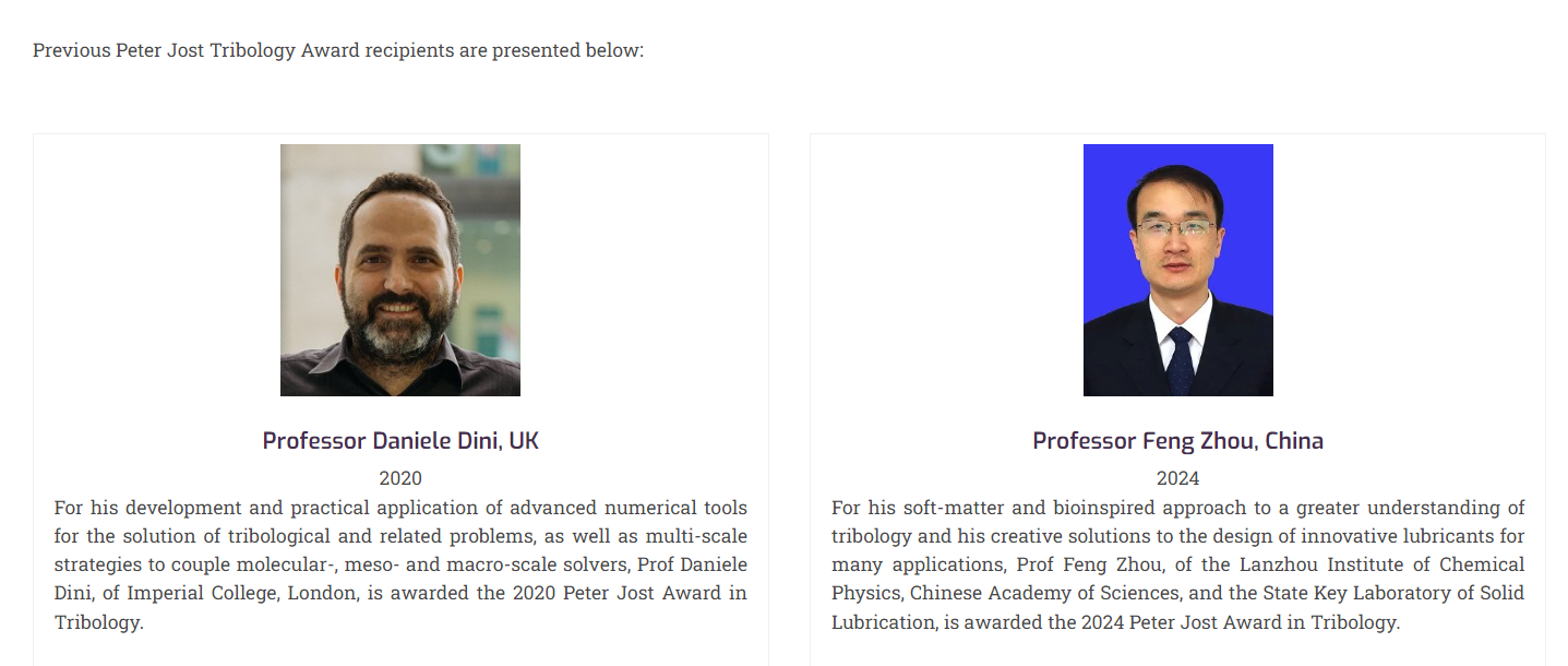 ????Peter Jost Tribology Award是由國際摩擦學(xué)理事會2020年設(shè)立的一個(gè)重要獎(jiǎng)項(xiàng),旨在表彰世界摩擦學(xué)領(lǐng)域做出杰出貢獻(xiàn)的科學(xué)家和工程師,特別是在提高摩擦學(xué)理論理解、開發(fā)新型潤滑材料、改進(jìn)材料摩擦和磨損性能等方面有著突出貢獻(xiàn)的人士,取得的成果不僅具有重要的學(xué)術(shù)價(jià)值,還應(yīng)該對工業(yè)和實(shí)際應(yīng)用產(chǎn)生深遠(yuǎn)影響。