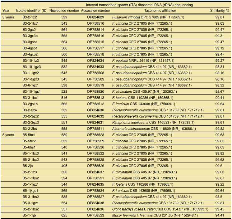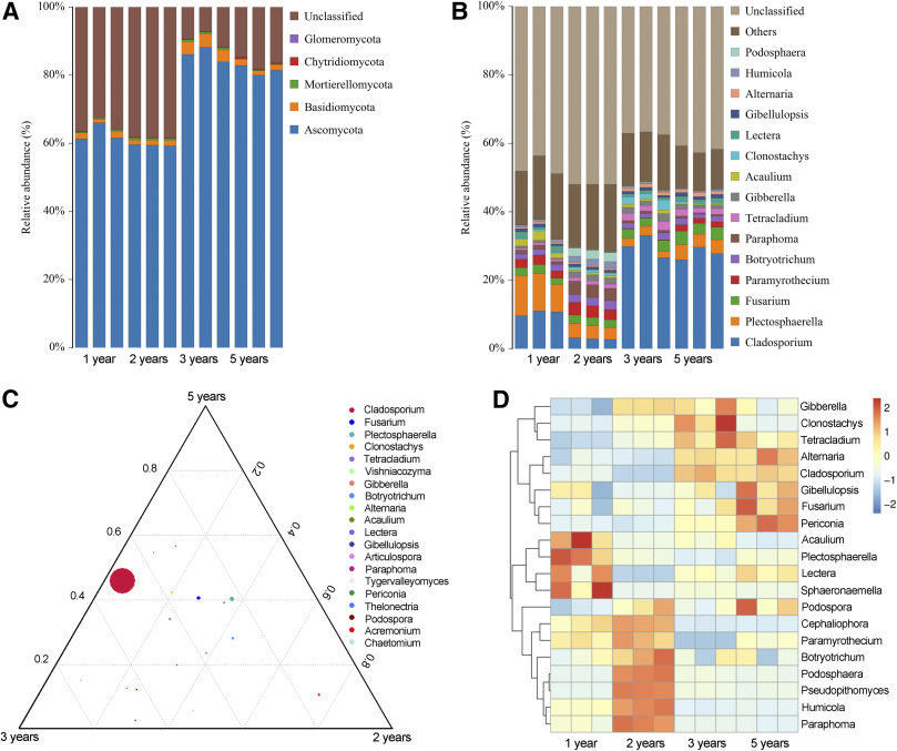 研究表明,黨參大田連作3年后,萎蔫和多種根腐病害頻發(fā);連作3年和5年土壤速效鉀含量和pH值顯著降低;與連作1年和2年相比,連作3年和5年的黨參根際土壤中真菌群落多樣性更高,并且一些屬水平的潛在致病性真菌分類群的豐度明顯增加;在連作3年和5年的黨參根際,共分離到Fusarium species complexes等菌33株;且屬水平真菌群落豐度與速效磷、全氮和土壤有機質(zhì)呈顯著正相關(guān)。