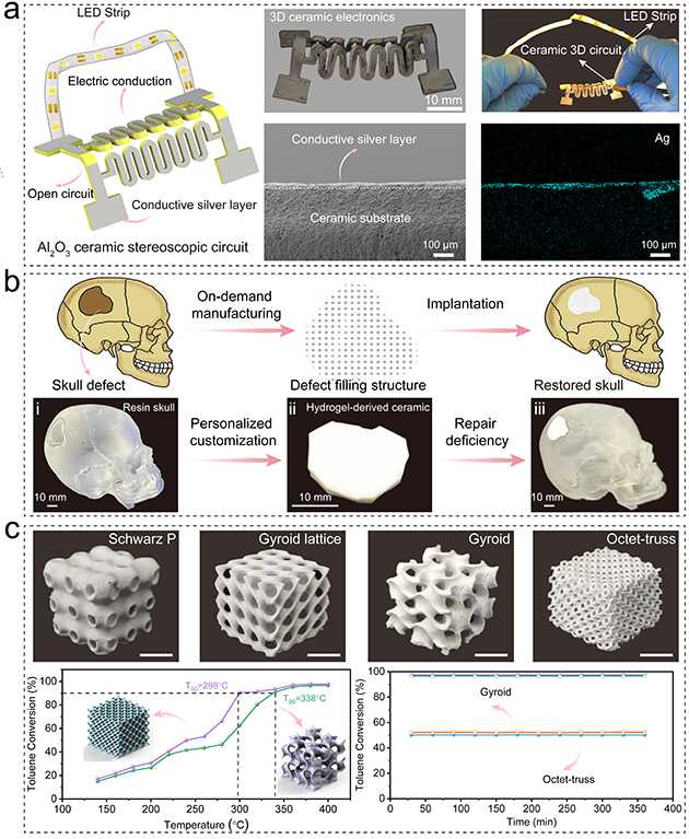 基于此方法,研究人員還可制造無(wú)支撐且大跨度的陶瓷三維電路,且這種陶瓷三維電路能很好地點(diǎn)亮LED燈帶。此外,利用水凝膠柔性骨架的可變形性,可按需或個(gè)性化制造具有顱骨缺損形狀的陶瓷結(jié)構(gòu)來(lái)實(shí)現(xiàn)骨缺陷部位修復(fù)。制造的陶瓷結(jié)構(gòu)還可結(jié)合表面改性策略創(chuàng)造性設(shè)計(jì)制備高性能的復(fù)雜結(jié)構(gòu)催化陶瓷器件,具有優(yōu)良的催化活性和穩(wěn)定性。研究人員還進(jìn)一步拓展了這種方法在三維電路、生物醫(yī)用及功能催化領(lǐng)域的潛在應(yīng)用(圖3)。