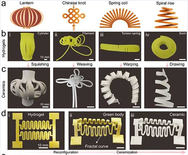 該團(tuán)隊(duì)受折紙/剪紙藝術(shù)啟發(fā),以水性無(wú)機(jī)粘結(jié)劑磷酸二氫鋁(AP)溶膠為水凝膠單體分散介質(zhì),將水凝膠單體和納米陶瓷粉體混合來(lái)制備光敏性水凝膠陶瓷漿料;利用光固化3D打印獲得具有優(yōu)異的延展性、形狀適應(yīng)性、抗疲勞性且可二次變形的水凝膠柔性骨架;依次經(jīng)過(guò)脫水干燥、低溫脫脂和高溫?zé)Y(jié)等步驟,實(shí)現(xiàn)了具有超低收縮、高陶瓷產(chǎn)率和形狀保真度的懸空大跨度陶瓷結(jié)構(gòu)(圖1)。設(shè)計(jì)的柔性水凝膠基陶瓷前驅(qū)體能夠?qū)崿F(xiàn)從平面形狀到3D立體結(jié)構(gòu)的轉(zhuǎn)變,突破了傳統(tǒng)硬質(zhì)/脆性陶瓷前驅(qū)體來(lái)制造復(fù)雜陶瓷結(jié)構(gòu)的局限。