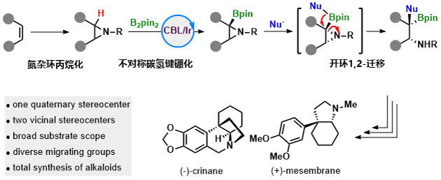 近日,該團(tuán)隊(duì)針對(duì)簡(jiǎn)單烯烴不對(duì)稱多官能團(tuán)化存在的問題,利用其發(fā)展的CBL/銥催化體系,結(jié)合烯烴的氮雜環(huán)丙烷化/開環(huán)1,2-遷移硼化的組合策略,實(shí)現(xiàn)了簡(jiǎn)單烯烴的不對(duì)稱三官能團(tuán)化反應(yīng),高對(duì)映選擇性地實(shí)現(xiàn)了鄰位季碳中心的手性胺。同時(shí),利用該方法,團(tuán)隊(duì)首次實(shí)現(xiàn)了從廉價(jià)易得的環(huán)己烯到石蒜科生物堿(-)-crinane和(+)-mesembrane的對(duì)映選擇性全合成。