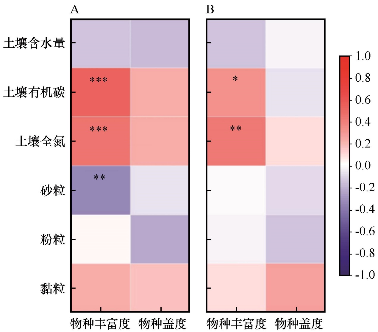 圖2 高大(A)和平緩(B)流動沙丘土壤理化性質(zhì)與植被群落特征相關(guān)性分析