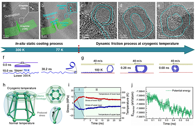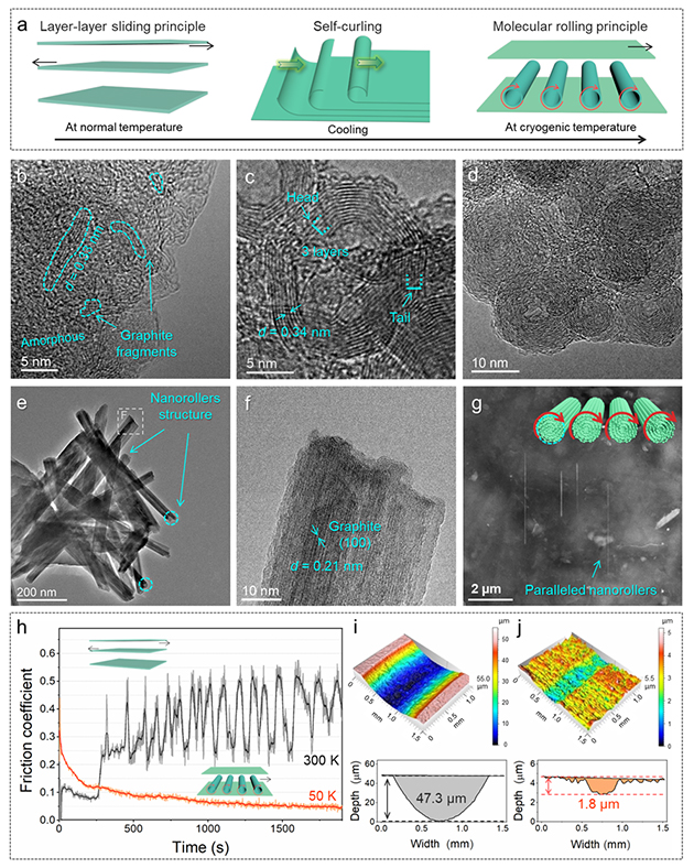 相關研究成果以“Acquisition of molecular rolling lubrication by self-curling of graphite nanosheet at cryogenic temperature” 為題發(fā)表在Nature Communications(2024, 5, 5747; https://doi.org/10.1038/s41467-024-49994-4)上。蘭州化物所博士后李畔畔和項目副研究員何文豪為論文共同第一作者,吉利研究員、魯志斌研究員、李紅軒研究員和陳建敏研究員為共同通訊作者。