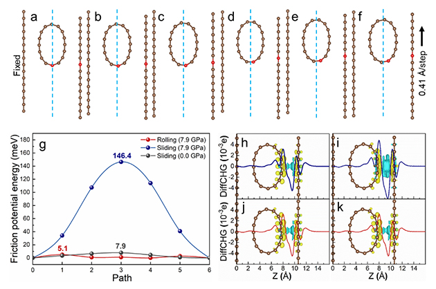 研究團隊發(fā)現石墨納米片在100K以下靜態(tài)低溫條件下會發(fā)生邊緣自卷翹的奇特現象;利用這一效應,在摩擦過程中剪切力可進一步驅動其在摩擦界面上原位形成納米卷軸結構,掃描電鏡圖像顯示這些納米卷軸呈現平行排列,且與滑動方向垂直,證明其發(fā)生了分子滾動潤滑。同時石墨表現出反常的宏觀真空潤滑特性,在50K真空條件下,潤滑狀態(tài)變得平穩(wěn)而長效,摩擦系數約0.06,磨損率僅為300 K時的1/50。通過密度泛函理論模擬計算,進一步揭示了分子滾動過程界面電荷能量耗散減弱的機制。該研究為解決傳統(tǒng)石墨類材料真空潤滑性能差和超低溫潤滑領域難題提供了全新解決思路和方案。