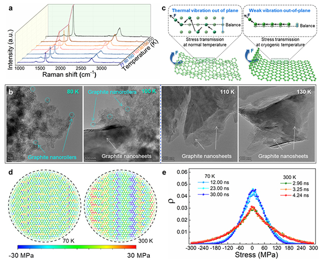 結合實驗和理論模擬系統(tǒng),研究團隊研究了石墨納米片邊緣自卷翹形變的影響因素、結構演變和形成機理。結果表明,超低溫環(huán)境下,非平衡溫度場導致了原子的不均勻收縮,石墨片上下表面產生了方向相反的應力,驅動了石墨片邊緣的自卷翹;同時發(fā)現熱振動對原子間應力傳遞的耗散作用,當溫度低于100K時,原子熱振動顯著減弱,原子間應力傳遞耗散被抑制,促進了石墨納米片自卷翹形變的發(fā)生。該研究將為認識微觀粒子受力傳遞規(guī)律和納米形變機理提供新的理解,同時發(fā)現了一種利用溫度操控自卷曲納米形變行為的新方法,在潤滑、傳感等眾多領域具有廣泛應用價值。