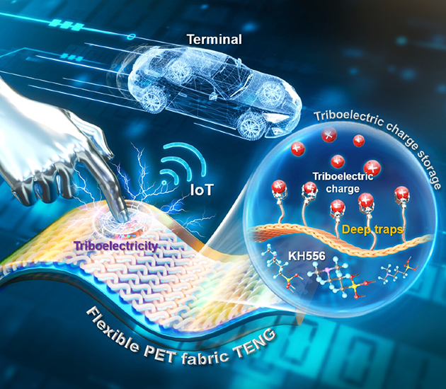 摩擦起電過程中產(chǎn)生的電荷會(huì)瞬時(shí)存儲(chǔ)在電介質(zhì)表面,進(jìn)而被兩種不同類型的陷阱(淺陷阱和深陷阱)捕獲。其中,淺陷阱中的電荷容易逸出,優(yōu)先耗散到環(huán)境中,而深陷阱中的電荷則因?yàn)闃O難逸出,可長(zhǎng)期儲(chǔ)存。因此,影響摩擦層電荷耗散率的關(guān)鍵因素是陷阱捕獲電荷和被捕獲電荷的逃逸能力?;诖?,該團(tuán)隊(duì)通過系統(tǒng)研究,揭示了載流子深陷阱在摩擦電荷存儲(chǔ)中的機(jī)制,通過分子自組裝技術(shù)在織物摩擦層界面構(gòu)建載流子深陷阱的方式增加TENG的電輸出,將該織物TENG用于物聯(lián)網(wǎng)可穿戴電子設(shè)備的電源模塊,實(shí)現(xiàn)了對(duì)機(jī)械運(yùn)動(dòng)的穩(wěn)定控制。相關(guān)研究成果發(fā)表在Advanced Materials(2024,2303389)上。