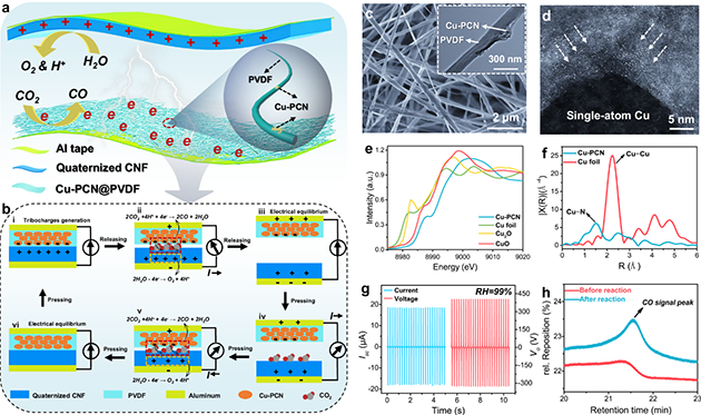 近日,研究團(tuán)隊(duì)與新加坡科學(xué)技術(shù)研究局的科研人員合作,在界面電荷利用方面做出新突破,利用單原子銅錨定的聚合物碳氮化物催化劑和季銨化纖維素納米纖維成功實(shí)現(xiàn)了接觸電催化CO2還原,生成CO的法拉第效率達(dá)到96.24?。?/span>。季銨化纖維素納米纖維由于含豐富的羥基,可在高濕度環(huán)境中與水分子形成氫鍵,固定水分子并參與接觸帶電并發(fā)生氧化反應(yīng),導(dǎo)致氧氣和質(zhì)子的產(chǎn)生,參與觸電催化CO2還原過程。這種方法在低濃度CO2環(huán)境中能高效地將其轉(zhuǎn)化為CO,為減少大氣CO2排放和推進(jìn)化學(xué)可持續(xù)性策略提供了一種解決方案。