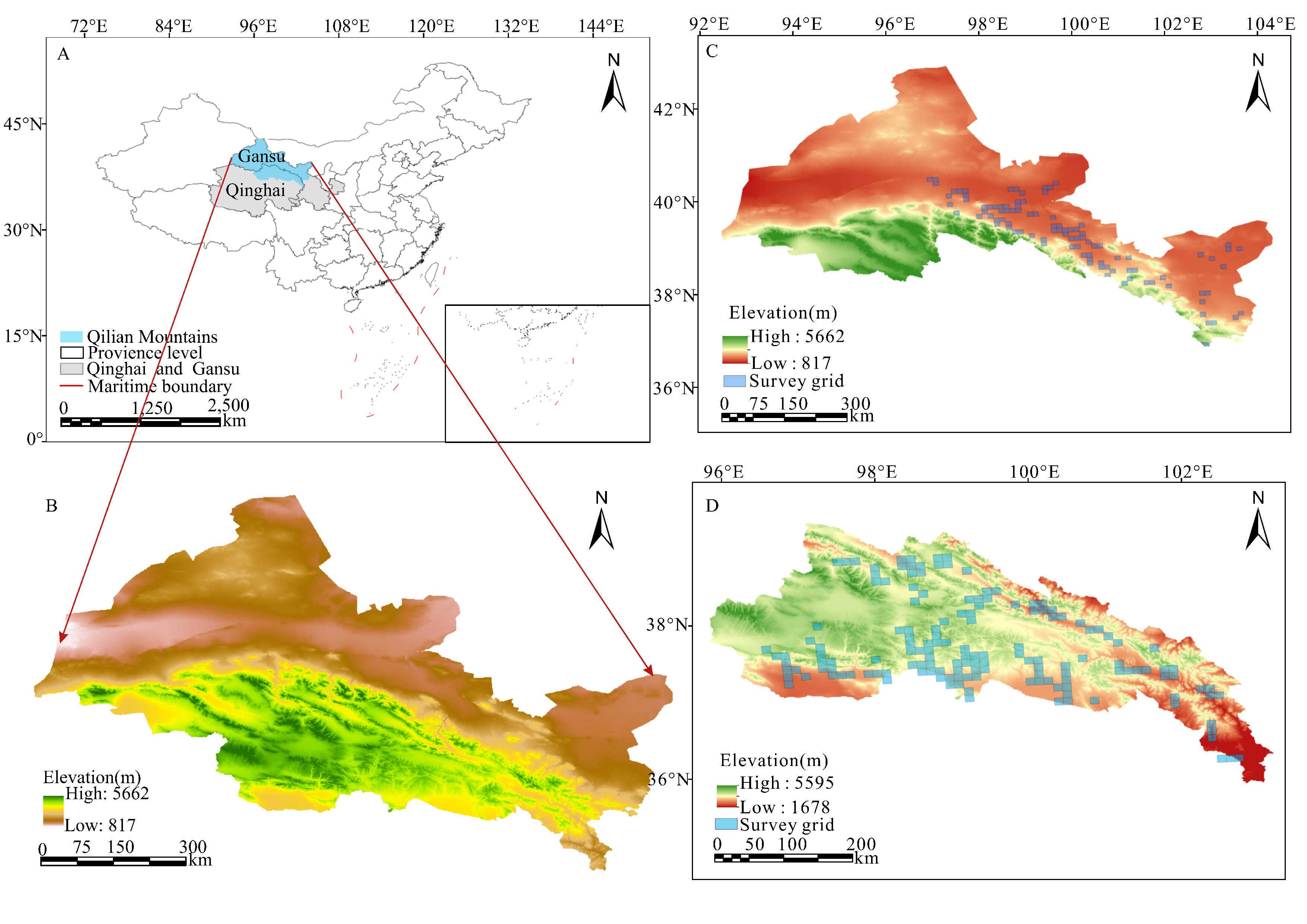 研究區(qū)域分布圖。(A)祁連山位置;(B) 祁連山海拔分布變化;(C) NSQM中鳥(niǎo)類(lèi)調(diào)查網(wǎng)格海拔分布變化;(D) SSQM