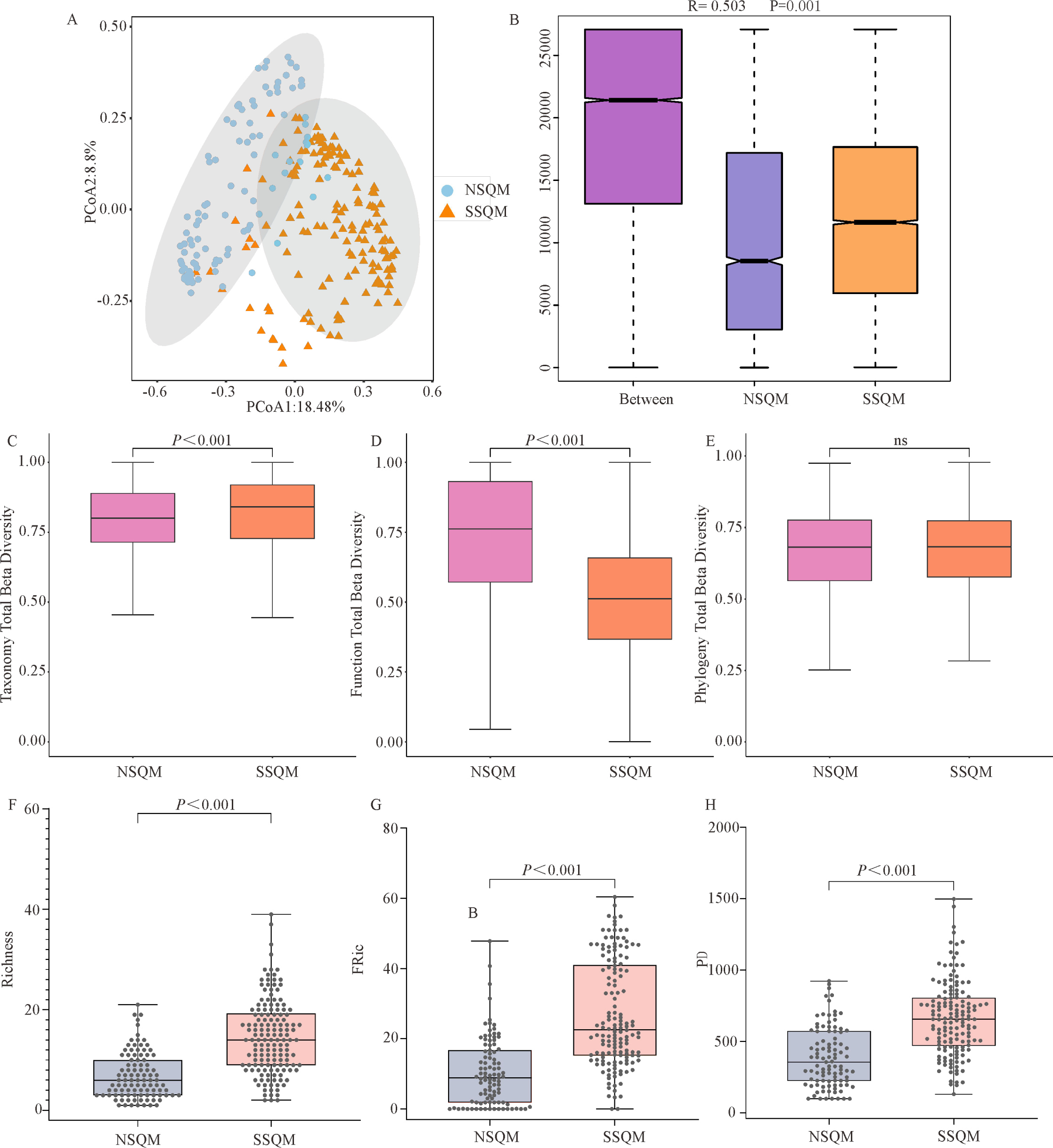 祁連山南北坡鳥(niǎo)類(lèi)群落多樣性格局。(A) NSQM和SSQM中鳥(niǎo)類(lèi)β多樣性的主坐標(biāo)分析(PCoA);(B) NSQM和SSQM中鳥(niǎo)類(lèi)群落的相似性(ANOSIM);(C, D, E) NSQM和SSQM中鳥(niǎo)類(lèi)群落分類(lèi), 功能, 系統(tǒng)發(fā)育總β多樣性;(F, G, H) NSQM和SSQM中鳥(niǎo)類(lèi)群落Richness指數(shù), FRic和PD指數(shù)
