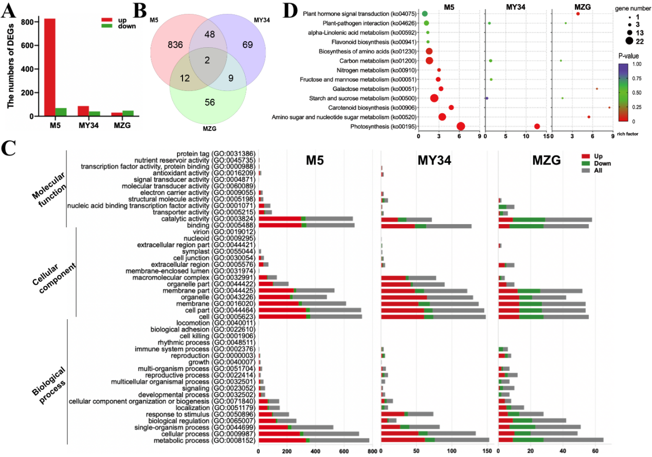 非靶代謝組結(jié)果表明,M5顯著積累蔗糖,而MZG和MY34分別顯著積累代謝物Euchrenone b6和甘露二糖。