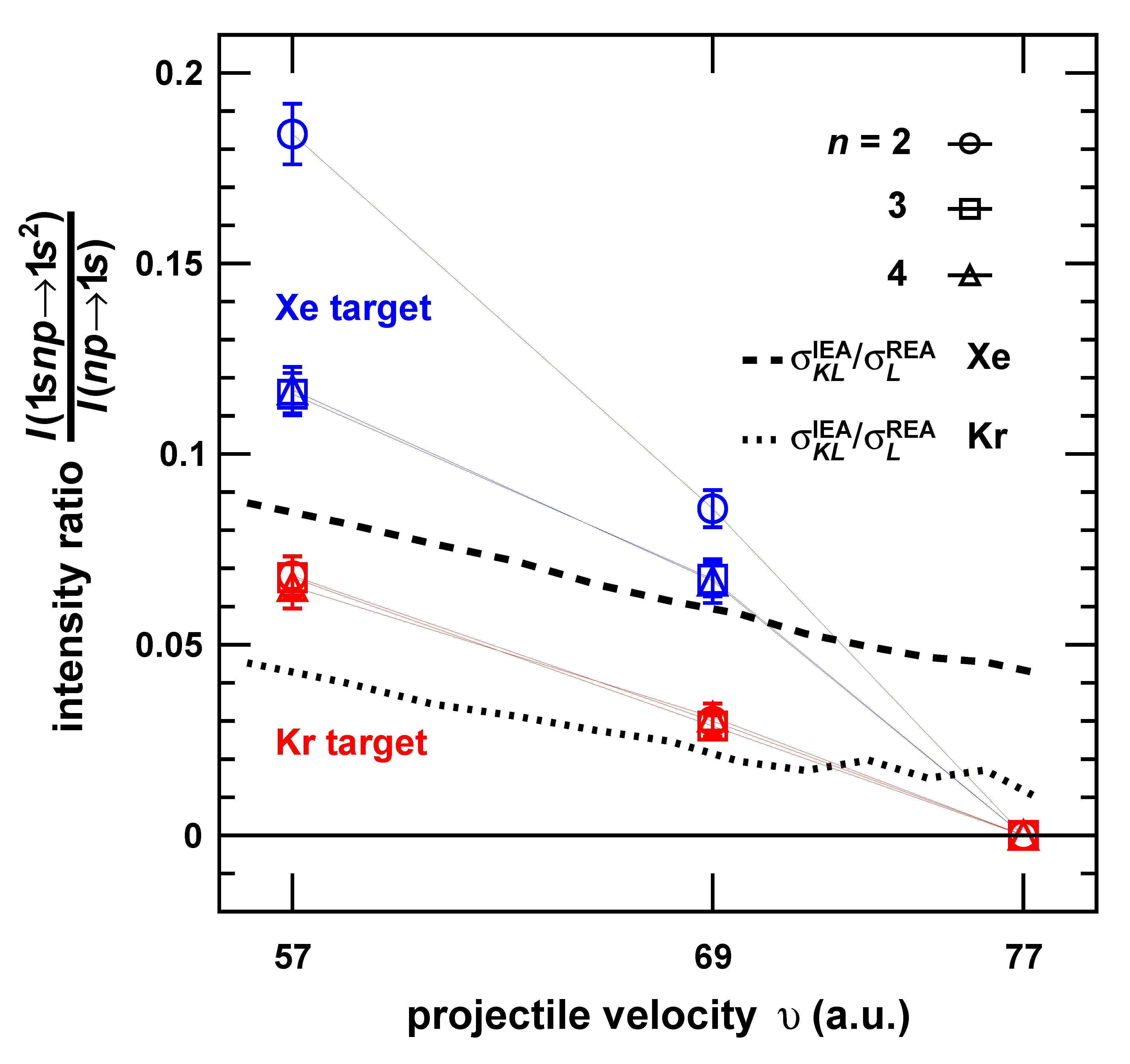 近代物理所原子分子譜學(xué)研究團(tuán)隊(duì)利用蘭州重離子加速器冷卻儲(chǔ)存環(huán)(HIRFL-CSR),開展了百MeV/u能區(qū)Xe54++Xe對(duì)稱碰撞實(shí)驗(yàn)研究。在“能級(jí)匹配”和“速度匹配”條件同時(shí)滿足時(shí),團(tuán)隊(duì)發(fā)現(xiàn)共振電子俘獲在非輻射雙電子俘獲(NRDC)過程中起重要作用,引起關(guān)聯(lián)俘獲,此時(shí)獨(dú)立電子近似不再成立。與之相反,Xe54++Kr碰撞中的NRDC過程是兩個(gè)獨(dú)立的單俘獲。