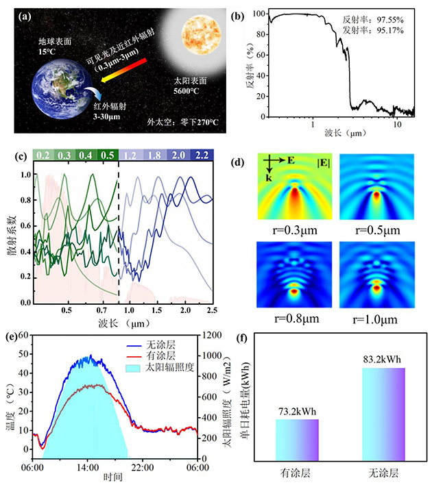 圖2.?。?/span>a) 構(gòu)建地球-太陽-外太空能源利用體系;(b) 輻射制冷涂層反射光譜;(c) 不同粒徑光學(xué)材料對(duì)0.5μm入射光的散射系數(shù)和(d) 電場(chǎng)分布;(e) 2024年8月18日06:00-19日06:00,太陽輻照度及儲(chǔ)能集裝箱表面溫度變化和(f) 空調(diào)制冷耗電量變化