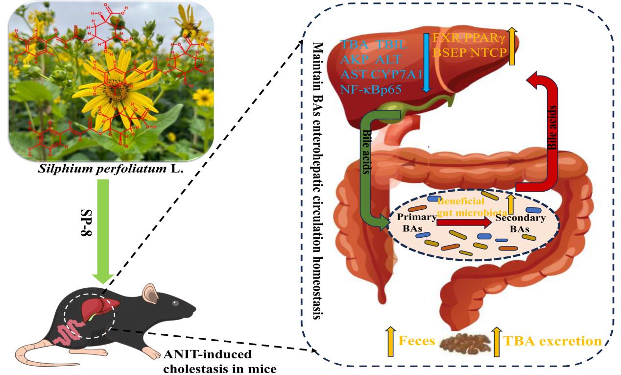 中國科學(xué)院西北高原生物研究所高原藥用資源生態(tài)保護與繁育研究團隊從一種傳統(tǒng)藥材中篩選得到咖啡??鼘幩峄钚越M份,對CLD具有顯著的治療效果。該組份不僅能夠通過調(diào)控FXR信號通路,減少BAs的合成,而且能夠通過促進BAs的肝腸循化,加速有害次級膽汁酸通過糞便排出體外,同時具有極強的抗炎活性,對膽汁淤積引起的肝臟損傷具有極強的保護和治療作用。該研究全面證實了咖啡??鼘幩峄钚越M份對膽汁淤積癥的治療效果并闡明了其作用機制,證實該組份具有很好的藥物開發(fā)潛力。