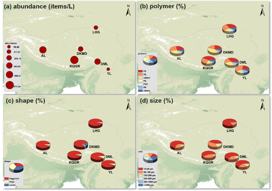 圖1 青藏高原典型冰川雪坑中微塑料的特征。其中:(a) 微塑料豐度,(b) 微塑料聚合物成分,(c) 微塑料形狀,(d) 微塑料尺寸分布。(YL-白水河1號(hào)冰川、DML-德姆拉冰川、KQGR-闊瓊崗日冰川、AL-昂龍冰川、DKMD-冬克瑪?shù)妆āHG-老虎溝12號(hào)冰川)。(Wang Z et al.,2024)