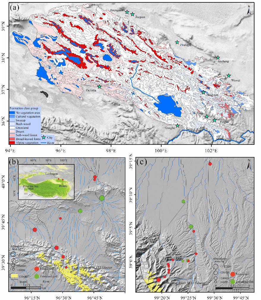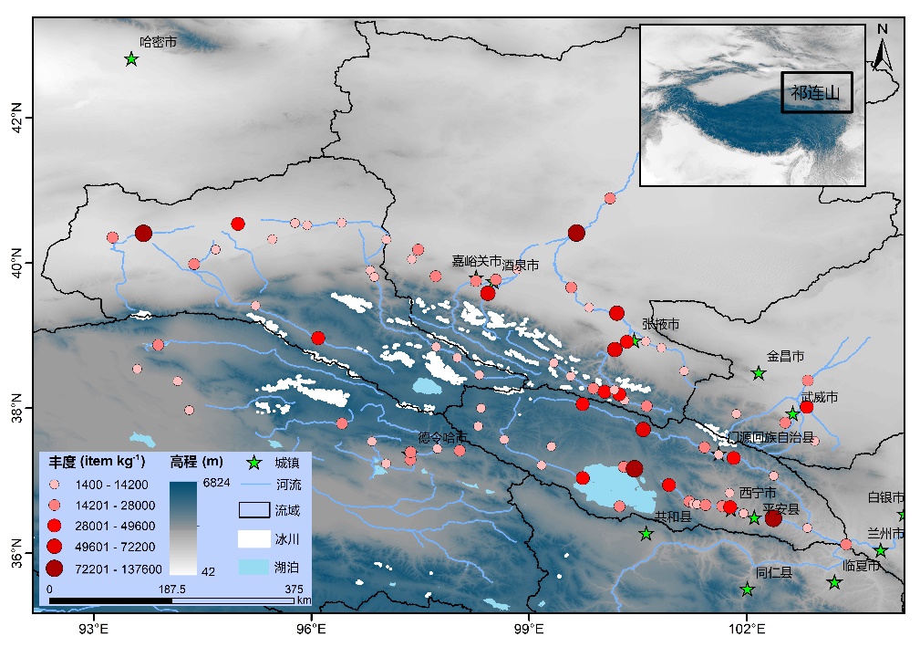 圖2 青藏高原祁連山地區(qū)以及典型流域表土中微塑料豐度分布圖 (Kang Q et al.,2024a,2024b)
