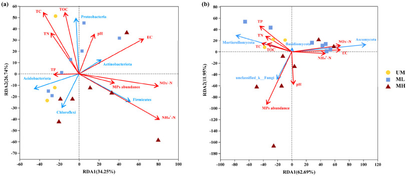 高通量測序分析表明,塑料圈中的α多樣性(Chao1和香農(nóng)指數(shù))低于土壤中的α多樣性,且隨土壤中微塑料豐度的變化而顯著不同。隨著微塑料豐度的增加,土壤中有機(jī)質(zhì)降解類群和光自養(yǎng)類群的比例也隨之增加,并顯示在塑料圈中富集。功能預(yù)測進(jìn)一步表明,微塑料的豐度影響了土壤的潛在功能,如與碳和氮循環(huán)相關(guān)的代謝途徑。與土壤環(huán)境相比,塑料圈中與有機(jī)物降解相關(guān)的功能豐度較高,且塑料圈的潛在健康風(fēng)險(xiǎn)更高。根據(jù)冗余(RDA)分析,可以確定環(huán)境理化性質(zhì)和微塑料豐度對(duì)真菌群落的影響大于對(duì)細(xì)菌群落的影響(圖3)。這表明,微塑料豐度會(huì)影響微生物多樣性組成,并可能影響土壤生態(tài)系統(tǒng)的整體性能。