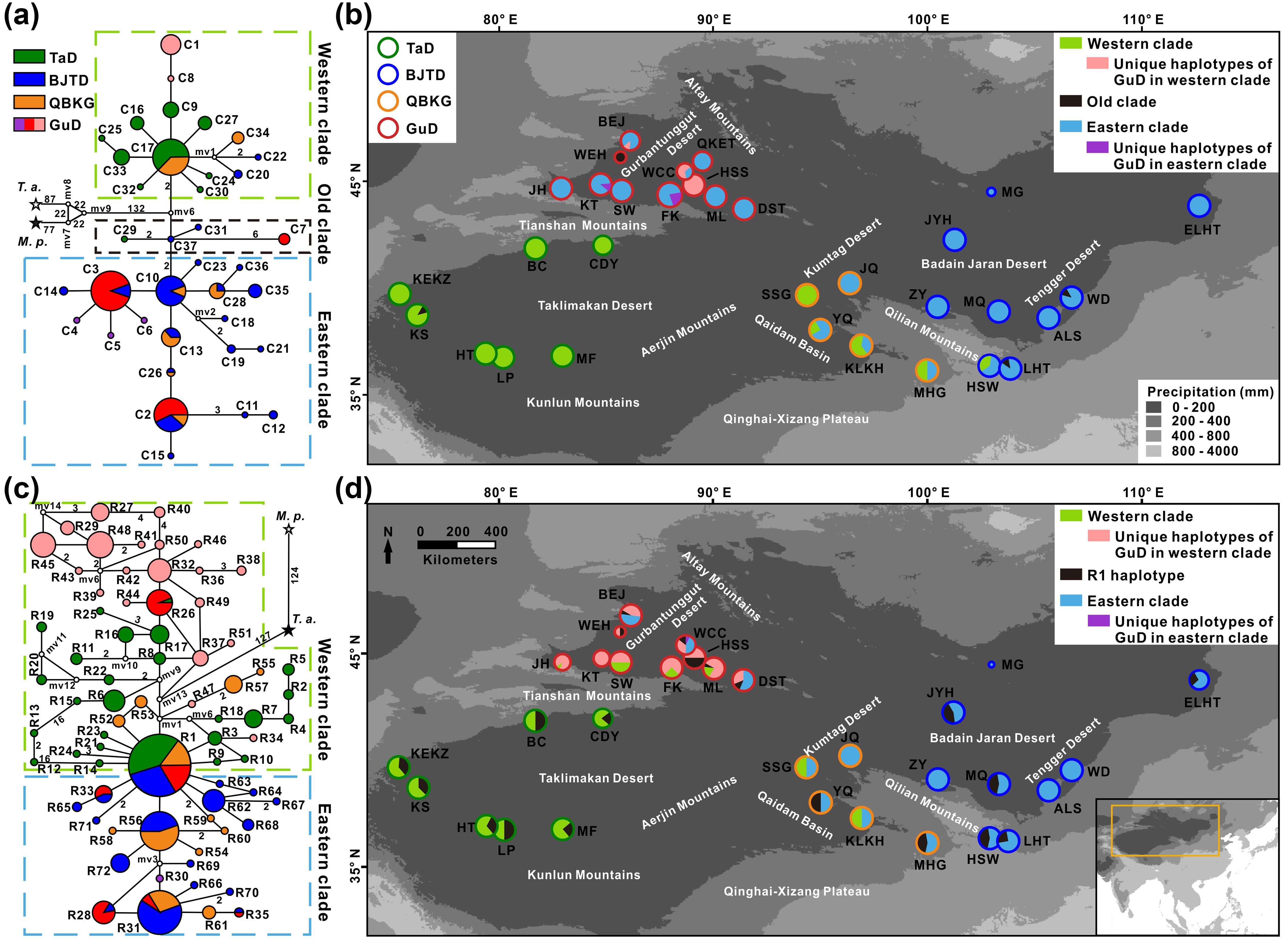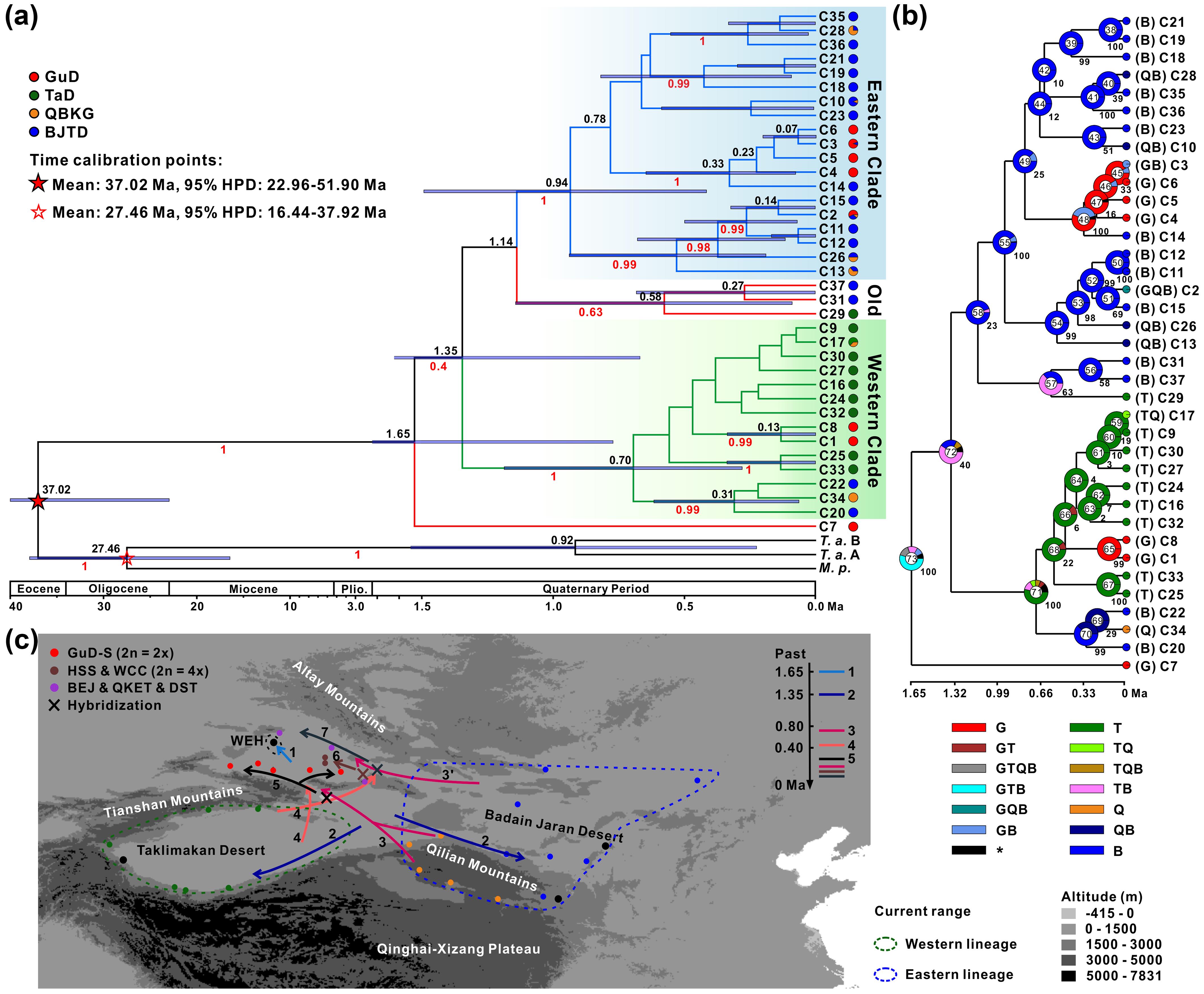 除烏爾禾群體以外,GuD-S和GuD-N的起源時(shí)間均晚于0.5百萬年前,推測第四紀(jì)氣候震蕩和昆侖-黃河運(yùn)動(dòng)導(dǎo)致的古爾班通古特沙漠多次收縮和擴(kuò)張,為親本支系之間或雜交后代與親本支系之間的二次接觸提供了機(jī)會(huì),是北疆紅砂種內(nèi)多樣性發(fā)生的主要原因,這為認(rèn)識準(zhǔn)噶爾盆地植物區(qū)系的復(fù)雜起源以及雜交在物種多樣性中的作用提供了一個(gè)范例。