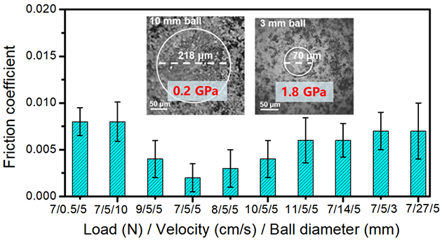 同時,研究人員發(fā)現(xiàn)碳薄膜表面石墨烯片段之間彼此排列角度各異、呈現(xiàn)出無序性。這種結構無序性誘導與石墨表面之間非公度性,加之薄膜整體成型制備避免了石墨烯邊緣暴露,有效減弱了阻礙結構超潤滑放大的邊緣效應,從而通過石墨島尺度逐級增加,實現(xiàn)了濕度不敏感超潤滑跨尺度放大。本研究也存在不足,近似無磨損的設計,限制了體系承載性等性能的提高。