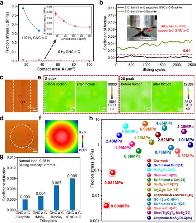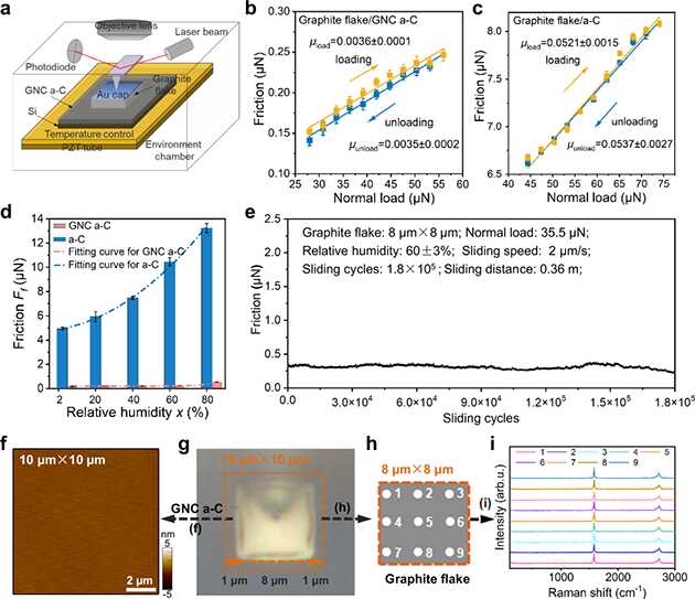 近日,研究人員針對固體表面濕度敏感、超潤滑跨尺度易失效等基礎科學問題開展系統(tǒng)研究?;谖墨I調(diào)研,發(fā)現(xiàn)固體表面濕度敏感源于磨損后暴露的新表面,導致與水分子作用強烈的化學斷鍵形成。研究人員提出了運動界面“(近似)無磨損無化學反應”思路,通過磁控濺射物理氣相沉積技術,制備石墨烯覆蓋表面的納米結構碳薄膜,構建碳薄膜/微觀石墨島體系,實現(xiàn)了穩(wěn)健、濕度不敏感超潤滑(即相對濕度2-80%下均實現(xiàn)超滑)。鑒于界面近似無磨損特性,該體系表現(xiàn)出結構性超潤滑性質(zhì)。