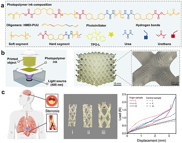 研究人員通過(guò)在聚氨酯前驅(qū)體中引入了脲基和酯基,發(fā)展了多重氫鍵誘導(dǎo)的可快速光固化3D打印的超分子聚氨酯彈性體,獲得的彈性體具有優(yōu)異的高彈性、高強(qiáng)度、韌性以及良好的生物相容性和血液相容性。具有高精度光固化3D打印性能的聚氨酯彈性體綜合了高性能與快速結(jié)構(gòu)制造方面的優(yōu)勢(shì),為具有優(yōu)異抗壓縮承載能力和機(jī)械穩(wěn)定性等特性的復(fù)雜柔性結(jié)構(gòu)生物醫(yī)療器械的制造提供了新的材料技術(shù)方案。