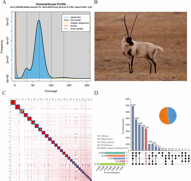 中國科學院西北高原生物研究所動物生態(tài)與資源保護研究團隊聯(lián)合青海大學,基于PacBio HiFi三代基因組測序、Hi-C測序和DNBSEQ-T7二代基因組survey測序三種測序技術(shù),成功組裝了藏羚染色體級別的基因組。結(jié)果顯示,藏羚基因組大小為3.1 Gb,Contig N50為84.6 Mb,所有基因掛載到30條染色體上(29?。),與之前的核型研究一致。數(shù)據(jù)評估顯示,藏羚基因組BUSCO得分為98.2%(S:92.3%,D:5.9%,F(xiàn):0.8%,M:1.0%),平均QV值為70.14,表明組裝的連續(xù)性好,完整度和準確性高?;贓DTA和RepeatModeler從頭預測的藏羚基因組中重復序列注釋結(jié)果表明,藏羚基因組重復序列主要由SINEs、LINEs、LTRs 和DNA transposons四種類型組成,序列總長度為1.65 Gb,占基因組的52.47%;基于蛋白同源預測、蛋白從頭預測和深度學習等多種策略,在藏羚基因組上共注釋到28,330個功能基因。綜上,通過多種技術(shù)手段,首次獲得了藏羚染色體水平的高質(zhì)量基因組和注釋信息,為藏羚的適應進化遺傳機制、保護遺傳學研究及進一步探索物種遷徙行為的遺傳機制提供了重要的基因組資源。