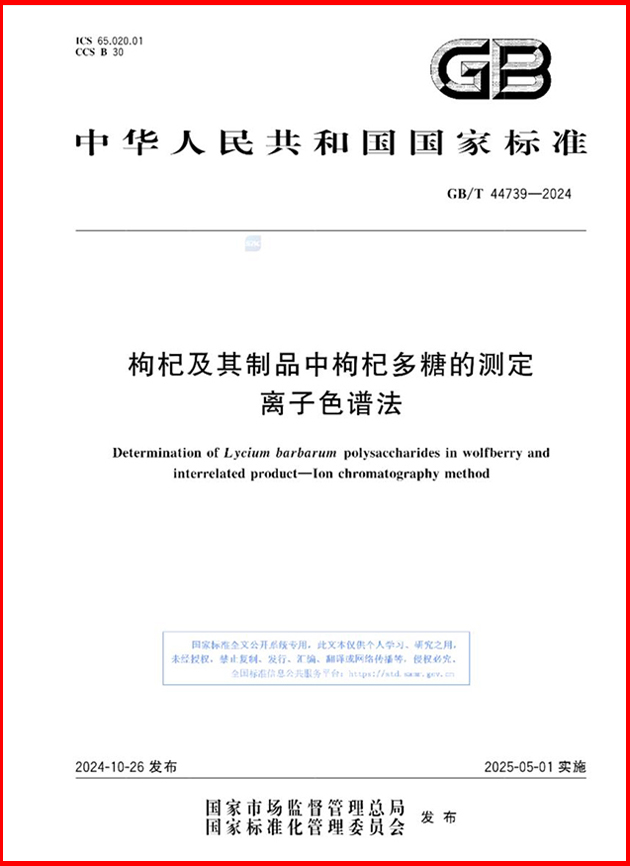 該團隊自2019年起,以枸杞多糖為研究對象,開展了枸杞多糖含量分析新方法的研究和國家標準的制訂。10月26日,由蘭州化物所牽頭、寧夏回族自治區(qū)藥品檢驗研究院等單位參與制訂的國家標準《枸杞及其制品中枸杞多糖的測定 離子色譜法》(GB/T 44739-2024),由國家市場監(jiān)督管理總局(國家標準化管理委員會)批準發(fā)布,將于2025年5月1日正式實施。