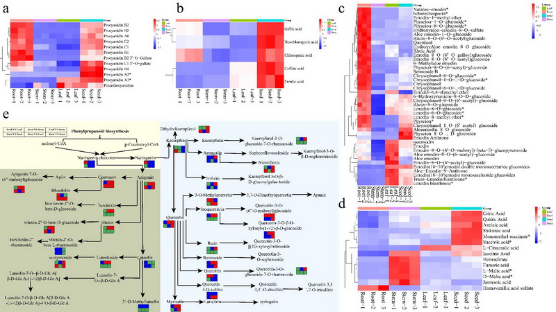 不同組織部分原花青素(a)、酚酸(b)、蒽醌(c)和有機酸(d)相對含量的熱圖及不同組織中黃酮醇生物合成途徑的一些關鍵代謝物的變化(e)