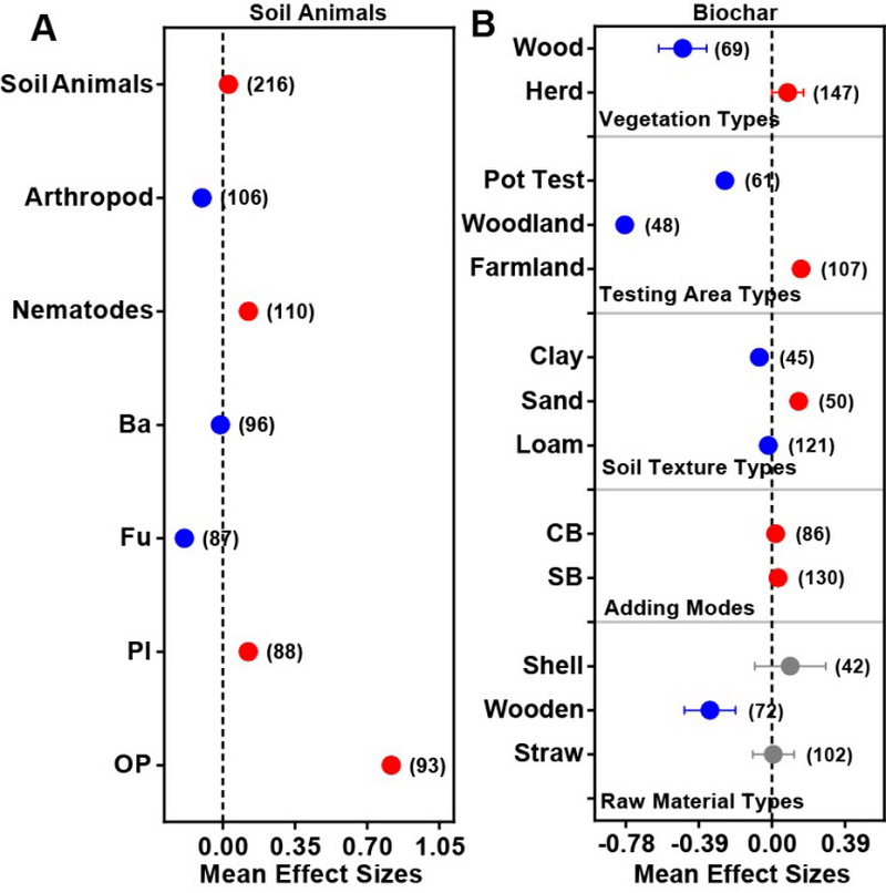 近年來,全球范圍內(nèi)對生物炭作為土壤調(diào)節(jié)劑的應用興趣顯著增加。土壤動物在土壤生態(tài)系統(tǒng)中種類繁多,并對土壤環(huán)境的變化表現(xiàn)出高度敏感性。它們在評估不同田間管理條件和土地利用狀況下的土壤健康方面發(fā)揮著至關重要的作用。生物炭對土壤動物的影響既包括土壤動物的直接取食作用,也涉及生物炭對土壤環(huán)境的間接影響。然而,目前尚缺乏關于生物炭添加對土壤動物影響的系統(tǒng)性和定量性研究。薈萃分析能夠促進對已有研究結果的定量整合,通過整合多個發(fā)現(xiàn),尤其是在特定主題下樣本量相對較小的情況下,可以提高統(tǒng)計效率,解決研究結果間的不一致性,探討現(xiàn)有文獻中的發(fā)表偏差,制定新的研究問題,并為進一步分析研究提供理論性框架和標準化體系。