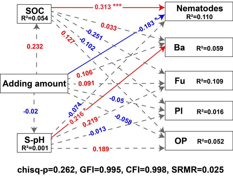 中國科學院西北高原生物研究所高寒濕地生態(tài)系統(tǒng)近自然修復與功能提升研究團隊開展了一項薈萃分析,旨在研究生物炭添加對不同處理和實驗條件下土壤動物的影響。結果表明:(1)生物炭的添加顯著增加了土壤動物的豐度(0.027),并改變了其群落結構;(2)生物炭促進了土壤線蟲的豐度(0.124),而抑制了土壤節(jié)肢動物的豐度(?0.101);(3)生物炭通過直接和間接途徑影響土壤動物的豐度,其中最顯著的途徑是由土壤有機碳(SOC)和土壤pH值介導的。生物炭添加的數(shù)量和持續(xù)時間對不同線蟲物種的豐度產(chǎn)生了不同的影響,最終導致土壤微型食物網(wǎng)結構的改變。