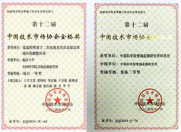 12月14日,由中國技術(shù)市場(chǎng)協(xié)會(huì)主辦的第十二屆中國技術(shù)市場(chǎng)協(xié)會(huì)金橋獎(jiǎng)表彰獎(jiǎng)勵(lì)大會(huì)在北京舉行,中國科學(xué)院青海鹽湖研究所獲項(xiàng)目獎(jiǎng)1項(xiàng)、集體獎(jiǎng)1項(xiàng)?!皩挏爻啼囯x子二次電池及其在高原高寒地區(qū)的儲(chǔ)能應(yīng)用”項(xiàng)目獲“項(xiàng)目一等獎(jiǎng)”,科技處獲“集體三等獎(jiǎng)”。