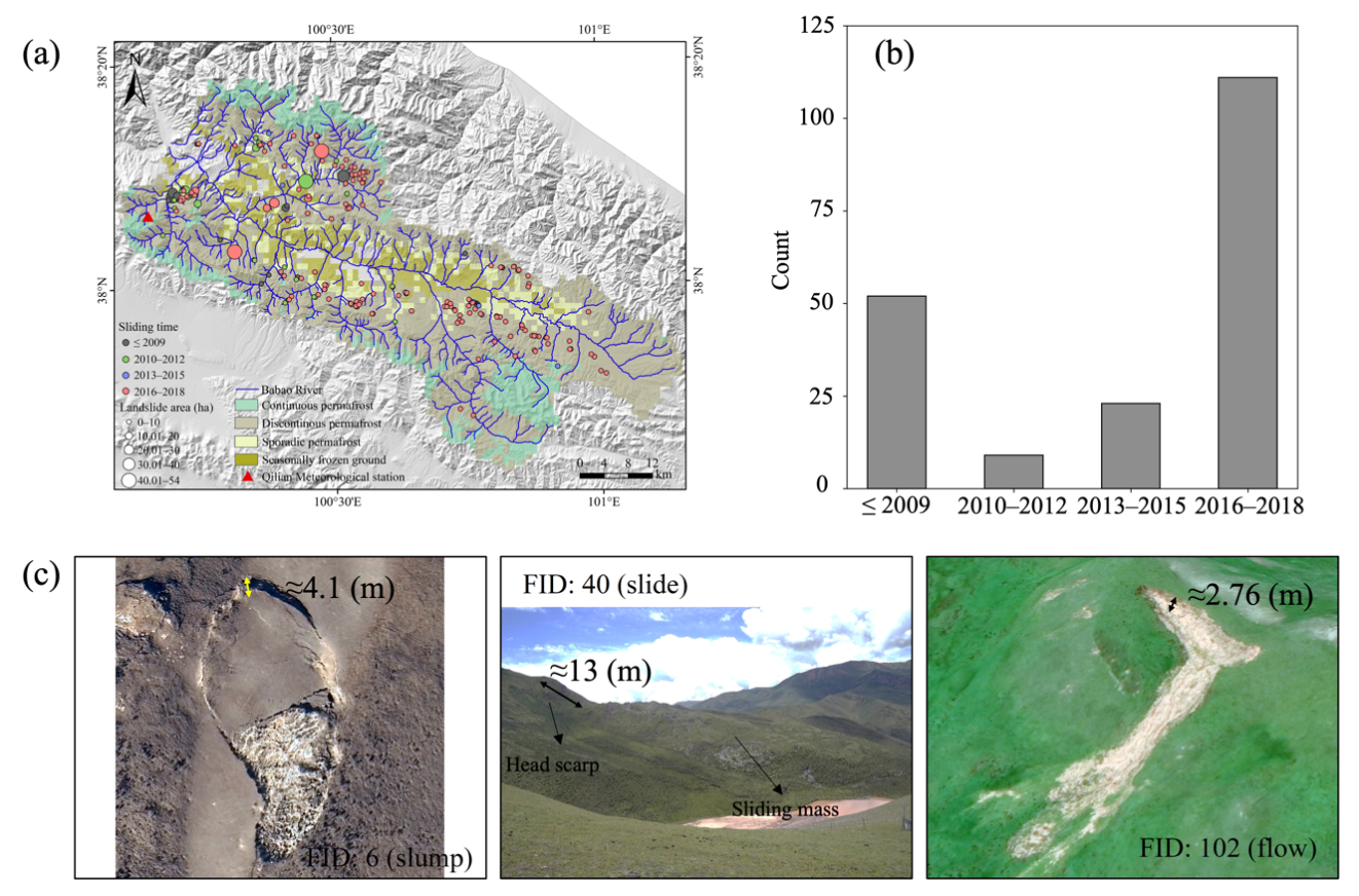 該成果以Elevation-dependent shift of landslide activity in mountain permafrost regions of the Qilian Mountains為題發(fā)表在Advances in Climate Change Research期刊,并獲國(guó)家重點(diǎn)研發(fā)計(jì)劃項(xiàng)目、國(guó)家自然科學(xué)基金項(xiàng)目和中國(guó)科學(xué)院“西部之光”基金項(xiàng)目等項(xiàng)目的資助。