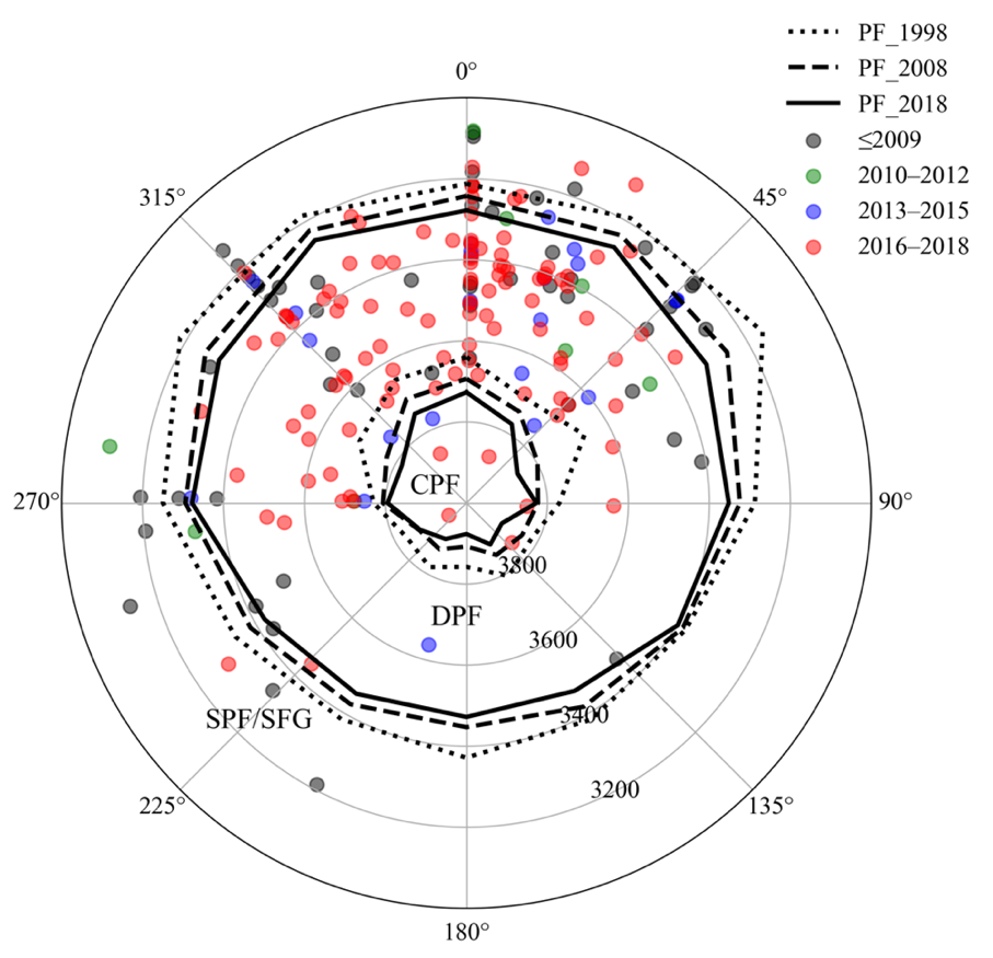 圖3:多年凍土邊界與滑坡的海拔、坡向和分布關(guān)系。三種不同線型分別代表1998年、2008年和2018年間稀疏多年凍土(SPF)、不連續(xù)多年凍土(DPF)和連續(xù)多年凍土(CPF)邊界的平均海拔。內(nèi)圈的三條線為SPF到DPF的過(guò)渡區(qū),外圈的三條線為DPF到CPF的過(guò)渡區(qū)。不同顏色的小圓點(diǎn)表示滑坡在各時(shí)間段的海拔、坡向和數(shù)量分布特征