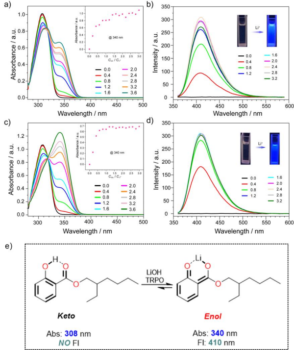 中國(guó)科學(xué)院青海鹽湖研究所研究團(tuán)隊(duì)對(duì)2-乙基己基水楊酸(ES)和三烷基磷酸氧化物(TRPO)混合萃取體系進(jìn)行了平衡、過(guò)程和機(jī)理研究。系統(tǒng)研究了影響鋰萃取的因素,如有機(jī)相組成、水相條件、萃取時(shí)間和ES萃取系統(tǒng)的酸堿耐受性。通過(guò)平衡研究,設(shè)計(jì)了從碳酸鋰母液中回收鋰的整個(gè)過(guò)程,包括萃取、洗滌、剝離和再生,并成功回收了99%的鋰,得到了含25.85 g/L鋰和0.08 g/L鈉的鋰富集溶液。研究表明,萃取過(guò)程是熱力學(xué)自發(fā)的熵增過(guò)程,在分子水平上,通過(guò)紫外-可見(jiàn)光譜(UV–Vis)、熒光光譜(Fl)、核磁共振(1H NMR)和傅里葉變換紅外光譜(FT-IR)闡明了配位機(jī)制。